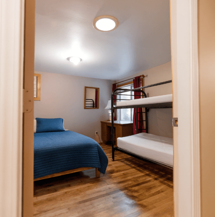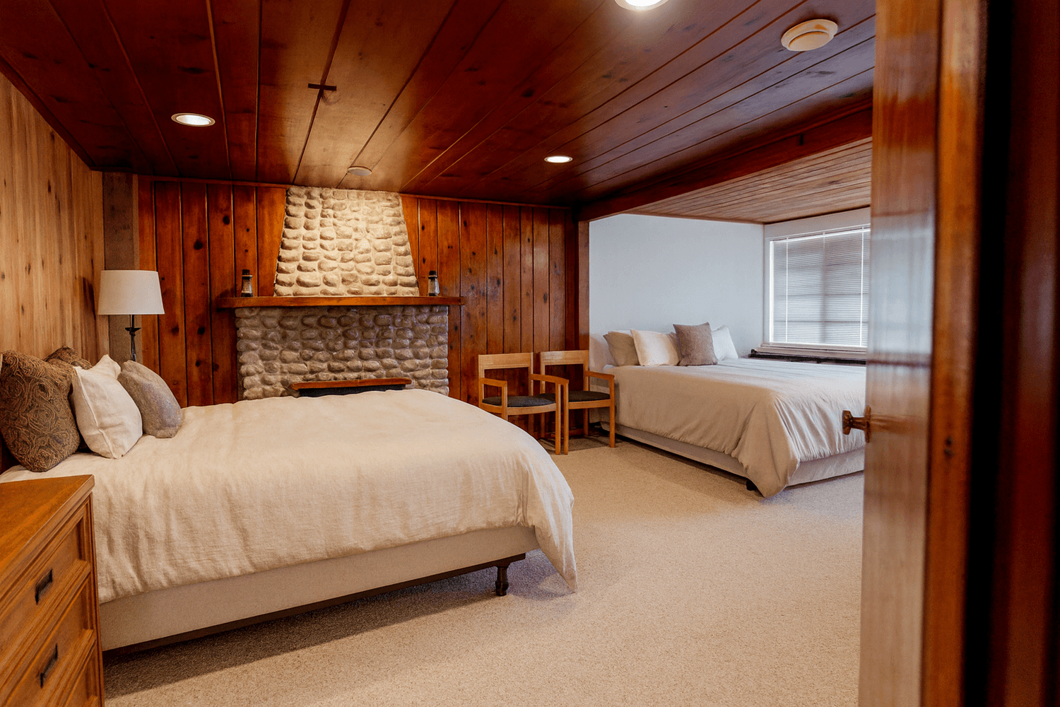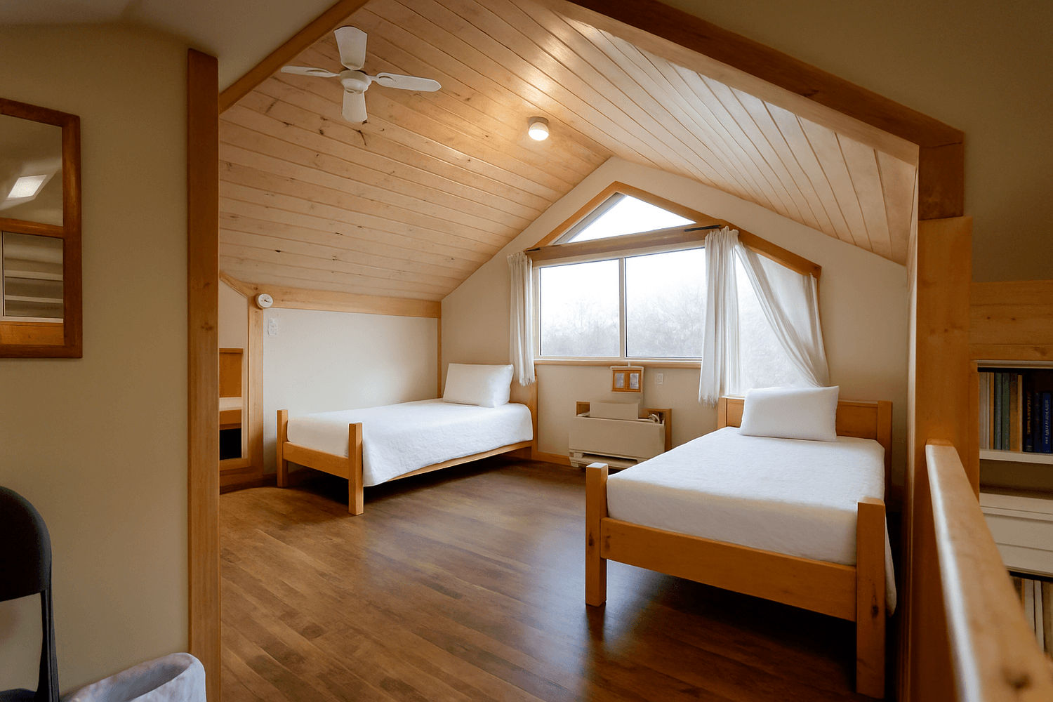 A simple shared loft with five twin beds. Light filters in through wood beams; it feels like camp for grown women who finally get to rest. Ideal if you’re comfortable sharing space and want connection built right in.